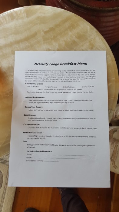 Det är Yvonne som vill veta vad vi önskar till frukost nästa dag. Det fungerar så att man meddelar vad man vill ha (finns en lista, se nedan) samt den tid man önskar frukosten på bordet i den gemensamma matsalen, eller på rummet om man så önskar. Hon hör sig även för om vi har lyckats få bord där vi önskar och erbjuder sin hjälp om så inte är fallet.
