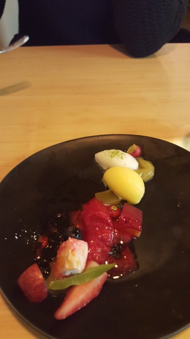 De två sista rätterna är efterrätter. Den första - bärkompott med sorbet hade räckt gott.