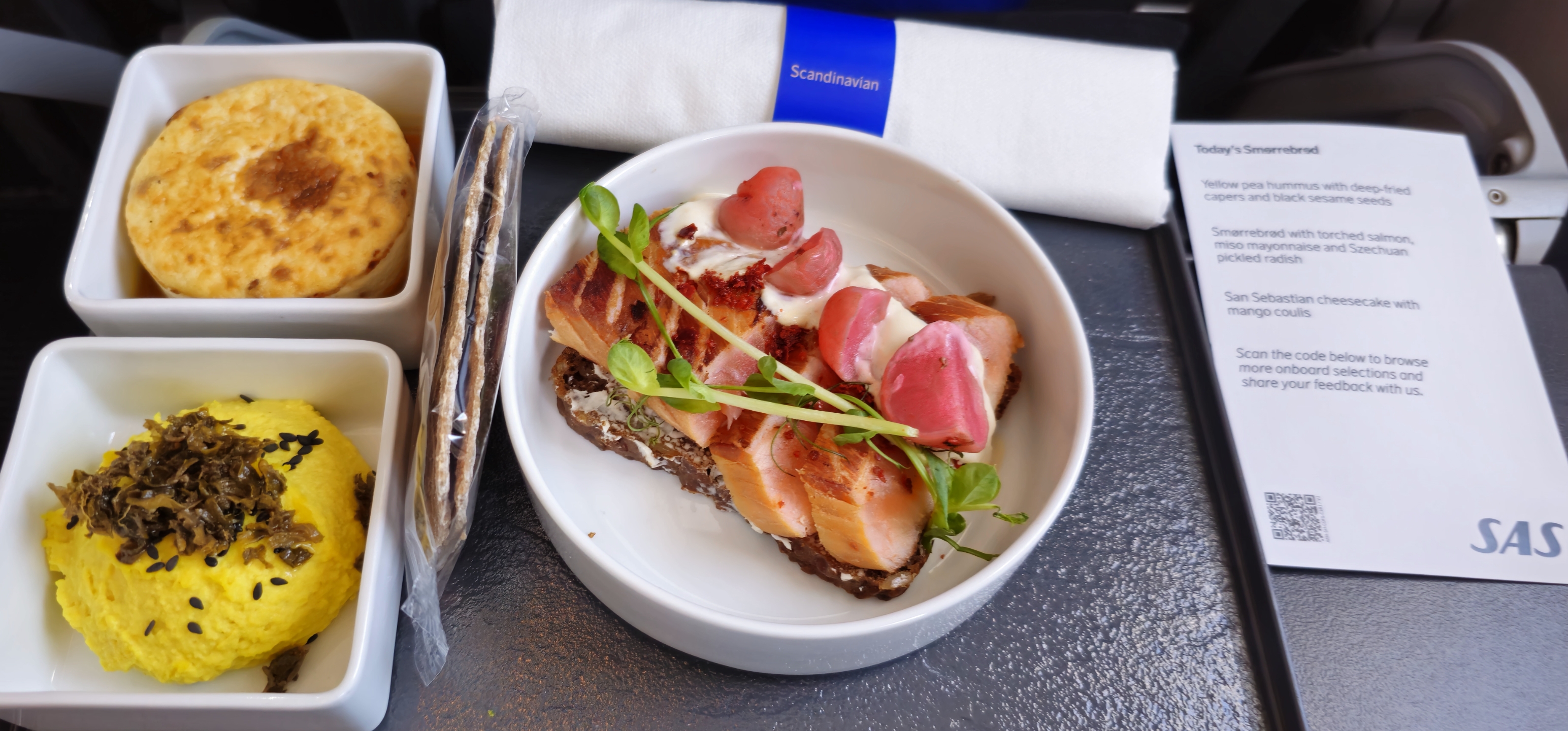 Första flighten med nya SAS Bussinesclass intra E idag , är inte så nöjd med serveringen, smaklös förrätt av kall gul "ärtsoppa" jag vet för mycket för att äta lax , smakade ändå men något med smaken av tillagningen ? och saknaden av något krämigt ... inget bröd ... Dokk efterrätten San sebastian cheesecake är bland det godaste jag ätit som efterrätt, letar efter recept för att kunna laga det själv