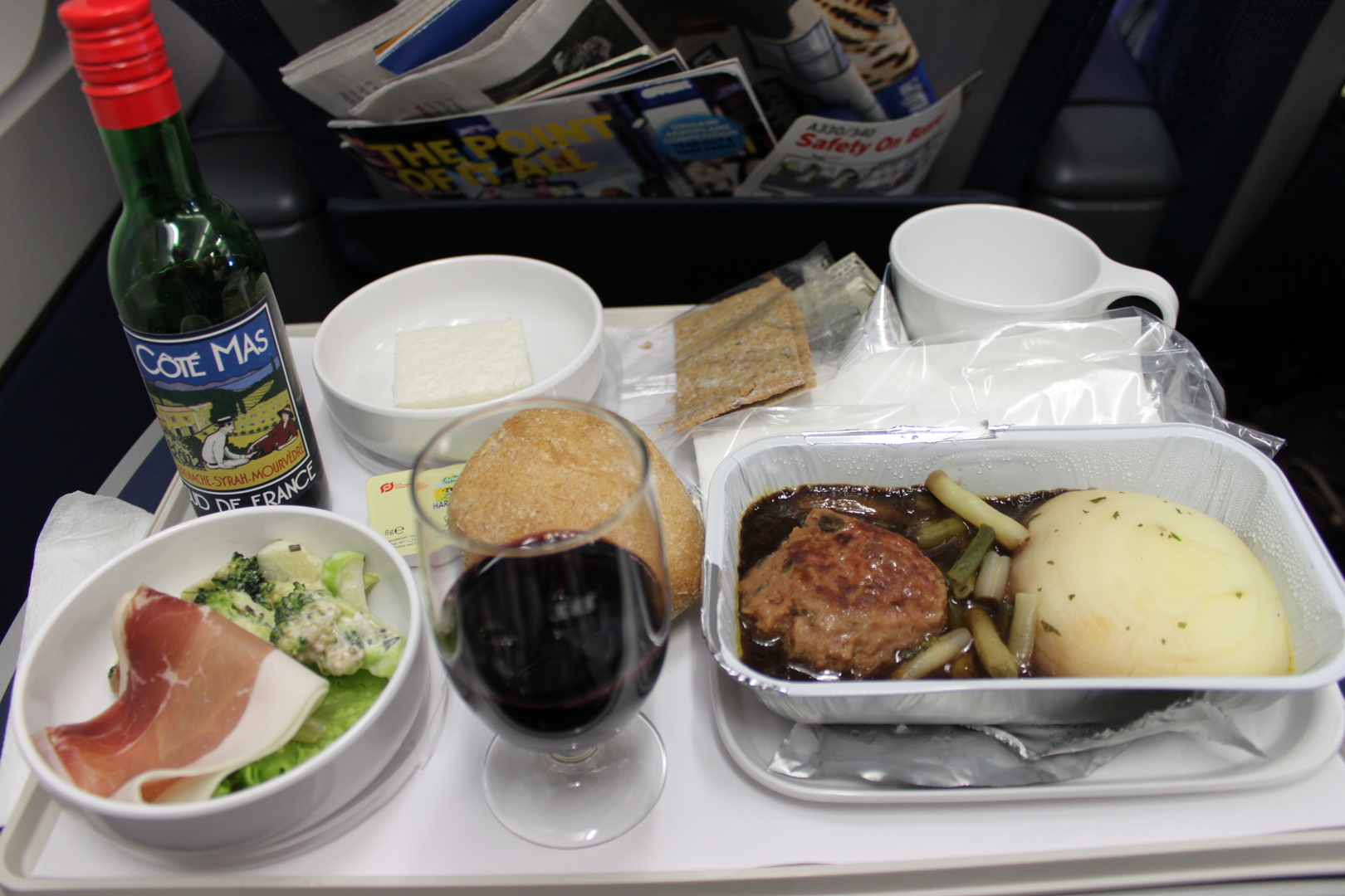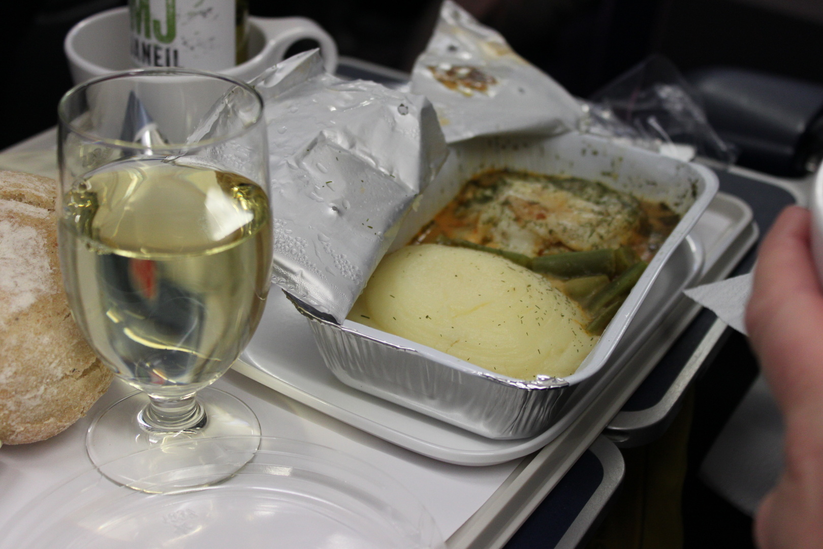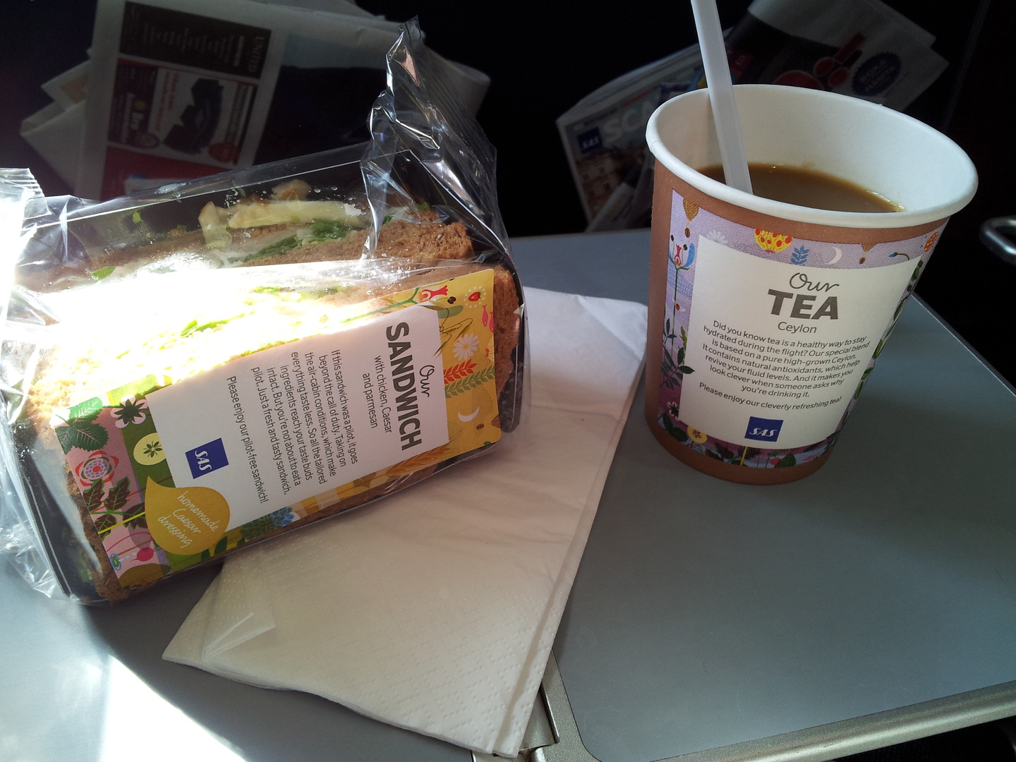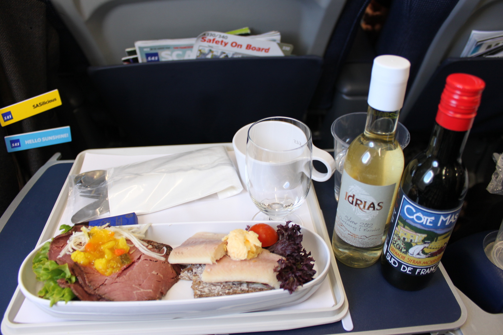 Till förrätt blev det en cesarsallad. Huvudrätten var antingen fläskfilé eller hummerravioli. Efterrätten var en citroncheesecake. Maten smakade helt okej och Sas behöver verkligen inte skämmas över sin mat på longhaul i ekonomi.