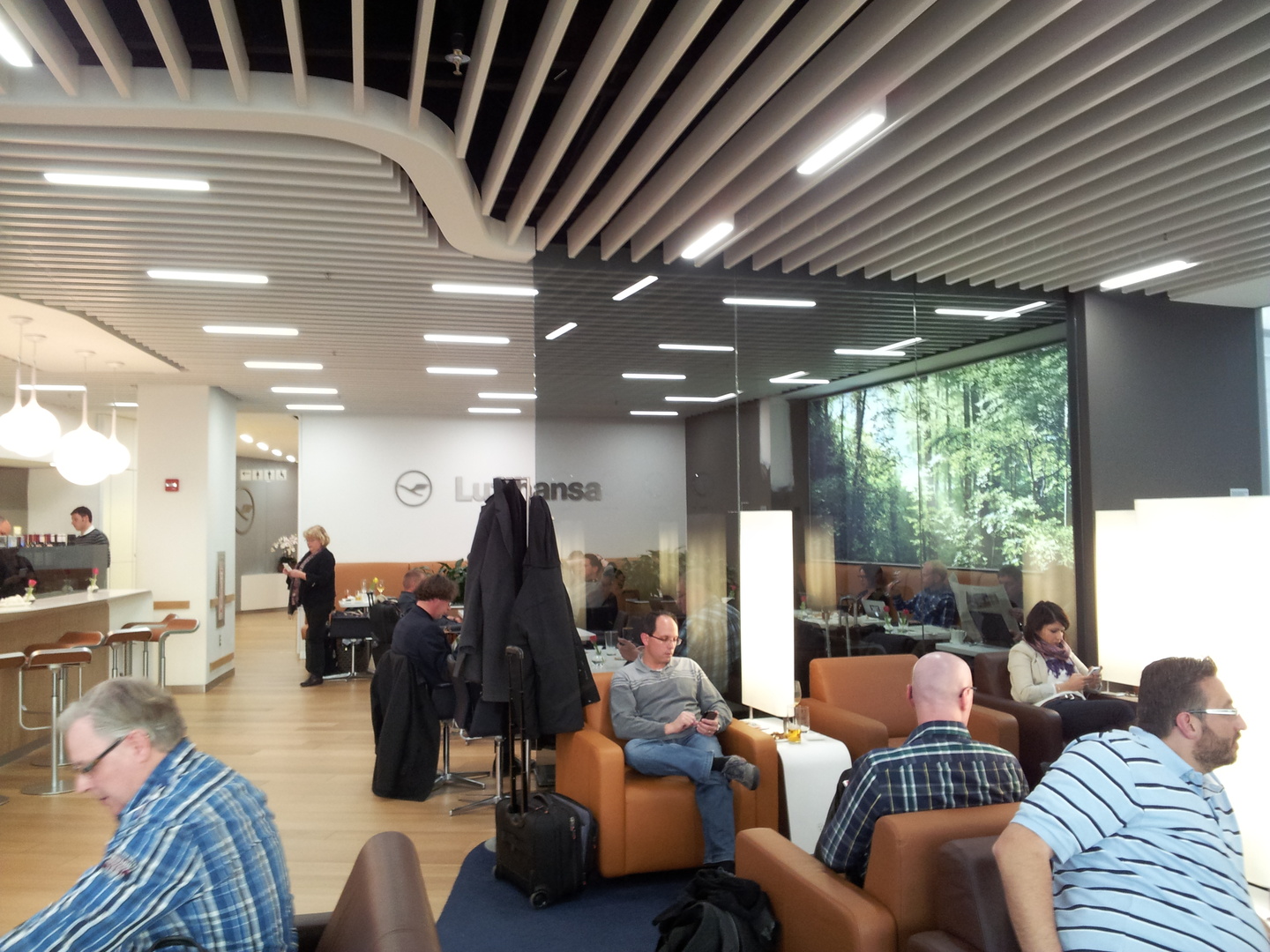 Nästa stopp blev inte Sas Lounge, utan Lufthansas nya fina Senatorlounge. Modernt och med bra utbud. Frågade försynt efter champagne och fick det snabbt levererat. Även påfyllning kom. Var vid det här laget ganska hungrig och matutbudet var mycket bra med både varma och kalla rätter. Provade en BC-drink; Hiller. God, men tog för mycket Campari.