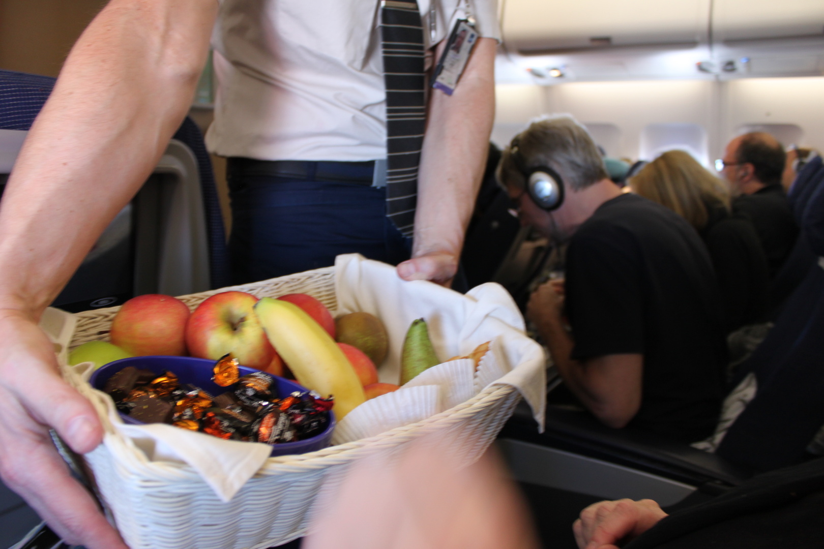 Tiden går och det blir dags för den andra måltiden. Nu serveras smörrebröd. Det var länge sedan jag åt smörrebröd så det smakar mycket bra. Till det även en frukt- och chokladkorg. Ett stort äpple på väg till stora äpplet kanske?