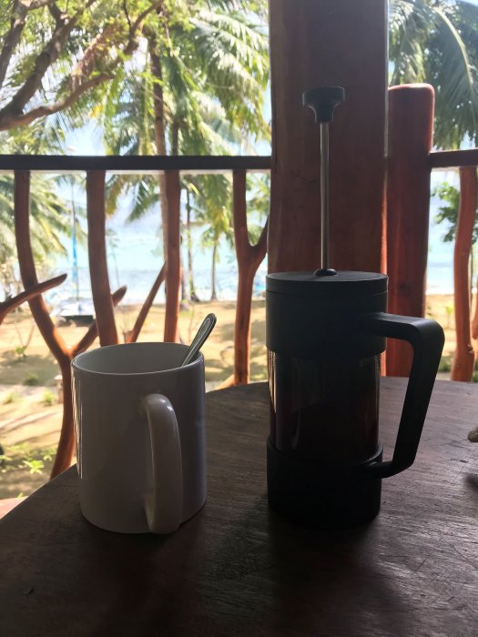 På balkonen med morgenkaffen. Perfekt til en weekendtur ud fra Manila med bare 35 minutters flyvetid (med Skyjet Airlines i BAe 146 - det føles som hjemme i Sverige, bortset fra at de ikke har fri seating her!) til Coron og cirka samme tid i bil+båd transfer til Sangat Island. Dejligt sted, med meget god mad og service. Som navnet på stedet antyder arrangerer de også dykning (og andre vand aktiviteter).