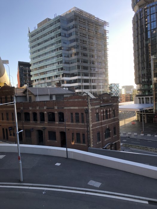 Inte jättehäftig utsikt, hotellet ligger under uppfarten till Sydney-bron men väldigt när Darling Harbour och runt 1km från The Rocks. Hotellet/Apartments Napoleon on Kent, prisvärt.
