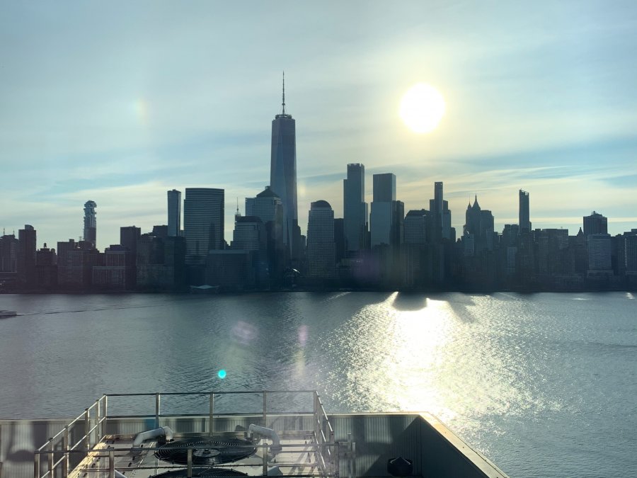 Brukar se det hotellet från Conrad på andra sidan floden. Soluppgången speglas fint i fasaderna på New Jersey-sidan