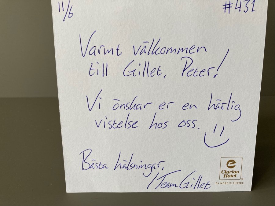 Hotell Gillet rum 431, en liten men personlig välkomst hälsning.
