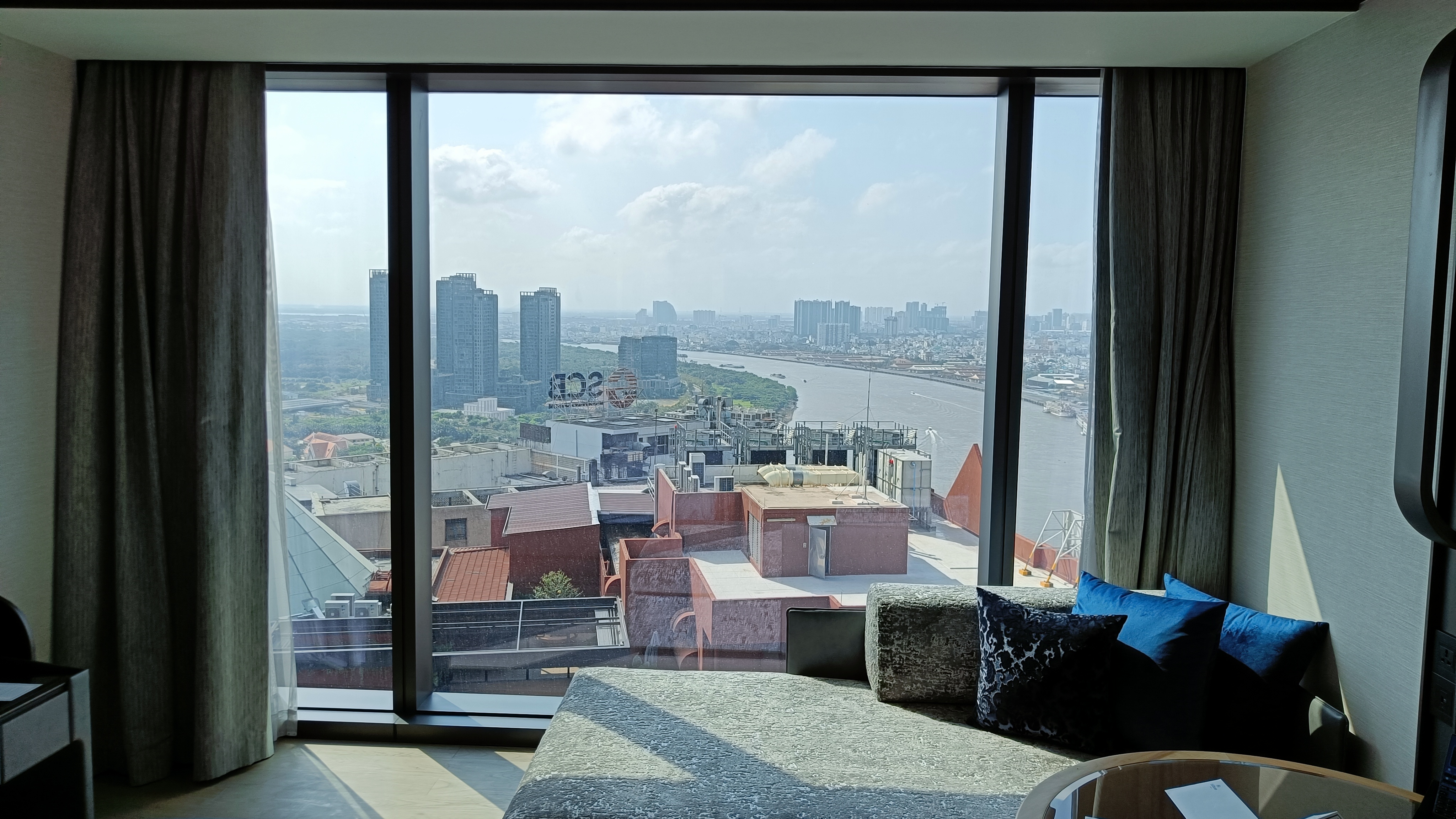 Hilton Saigon - inte ens 30.e våningen räcker riktigt till för att komma fritt från Mê Linh Point Tower för att få se hela flodsvängen i ett "River view room". Skulle tro att Renaissance Riverside strax bredvid har en väldigt trevlig utsikt.