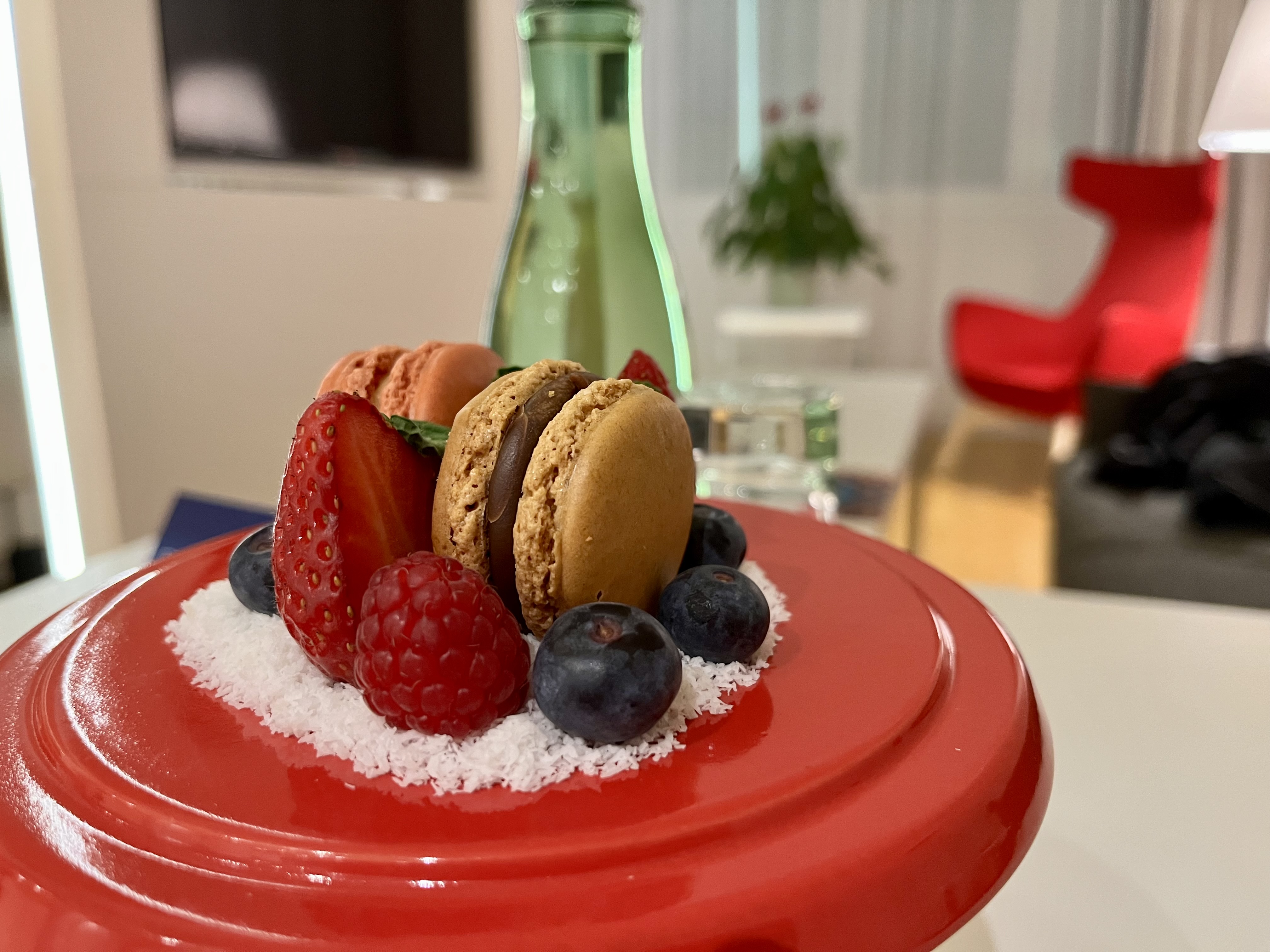 Nu när vi kom tillbaka till rummet så kom en tjej och knackade på för att lämna över ett durkslag med frukt och bär!