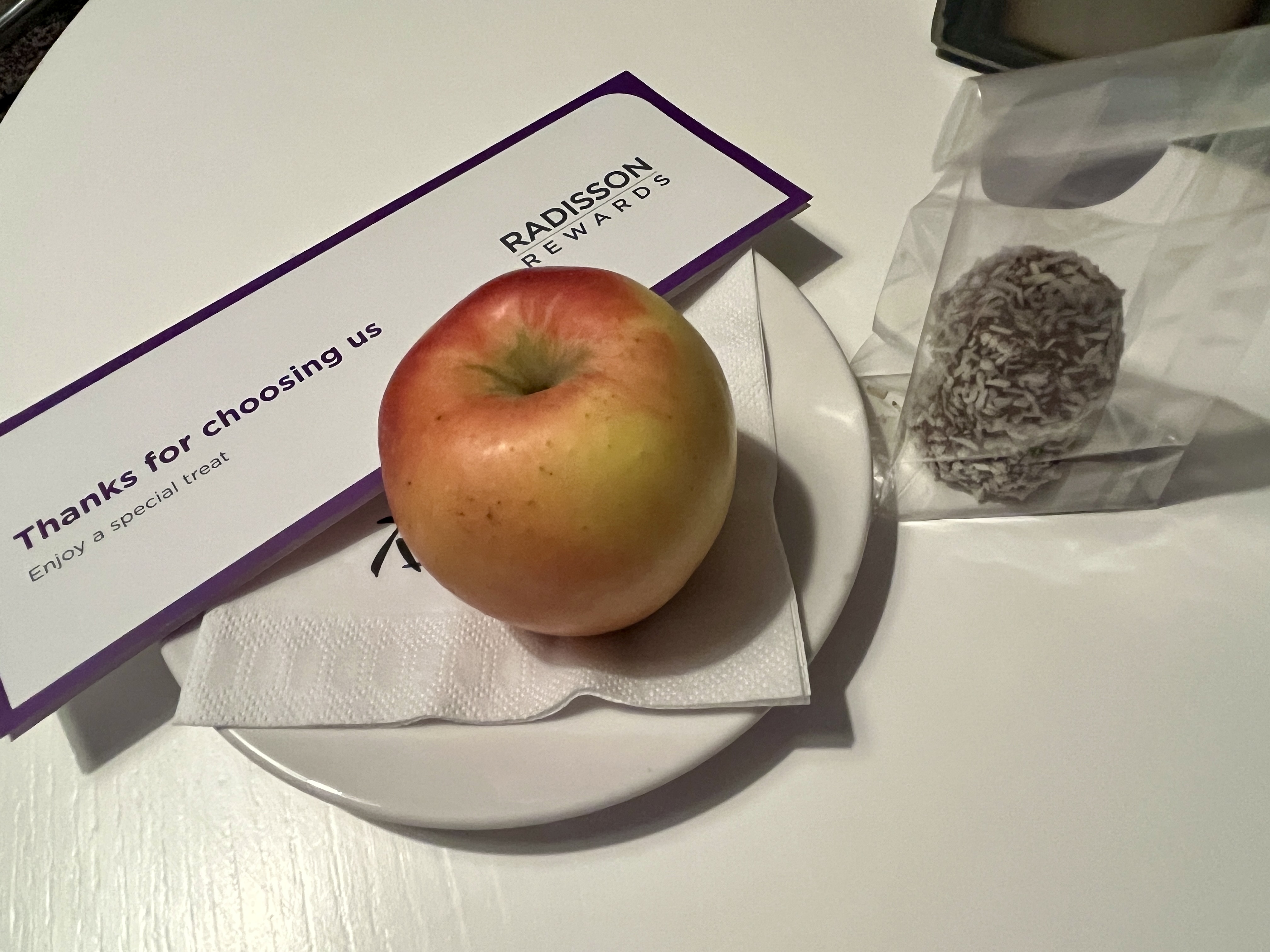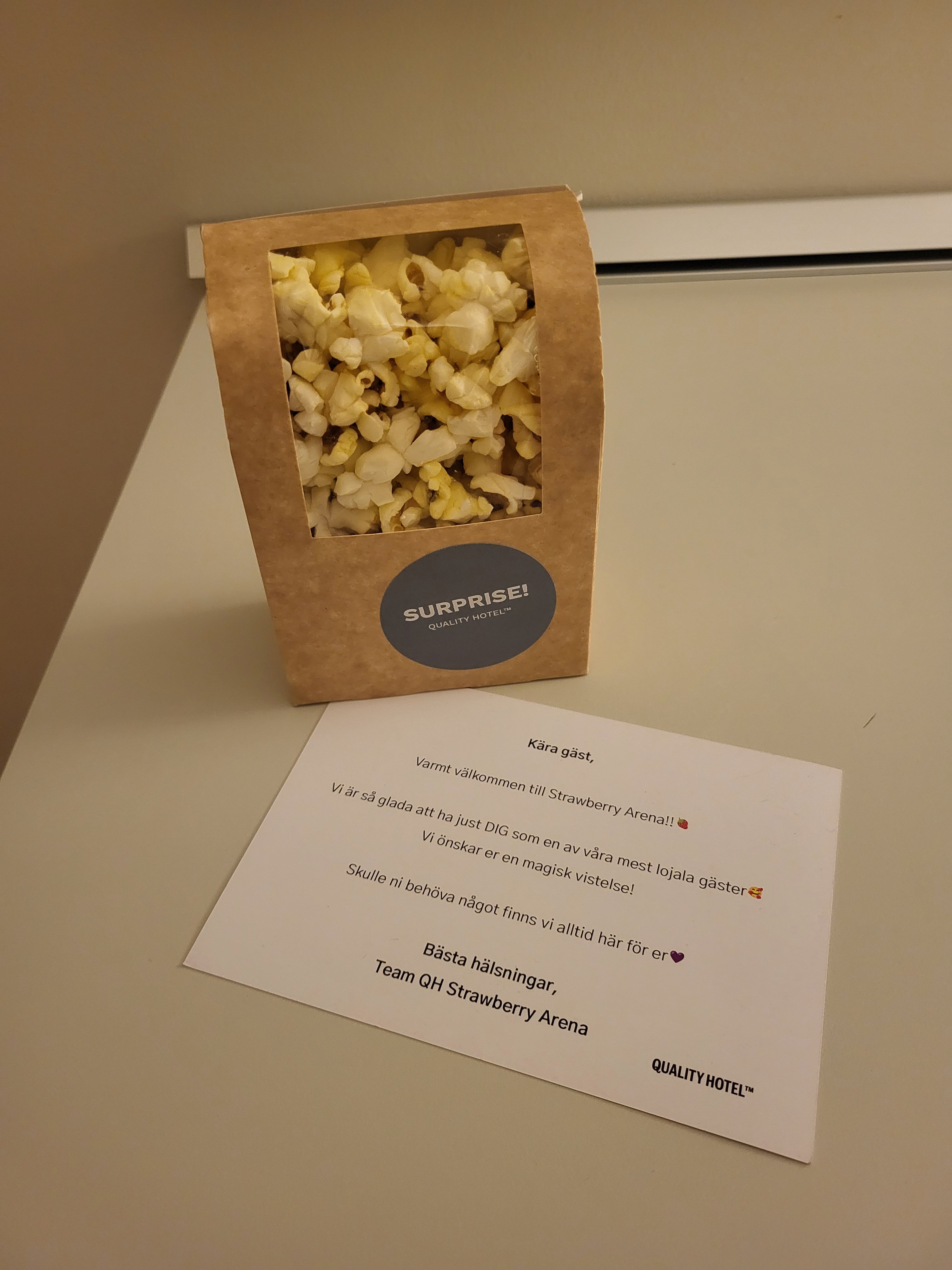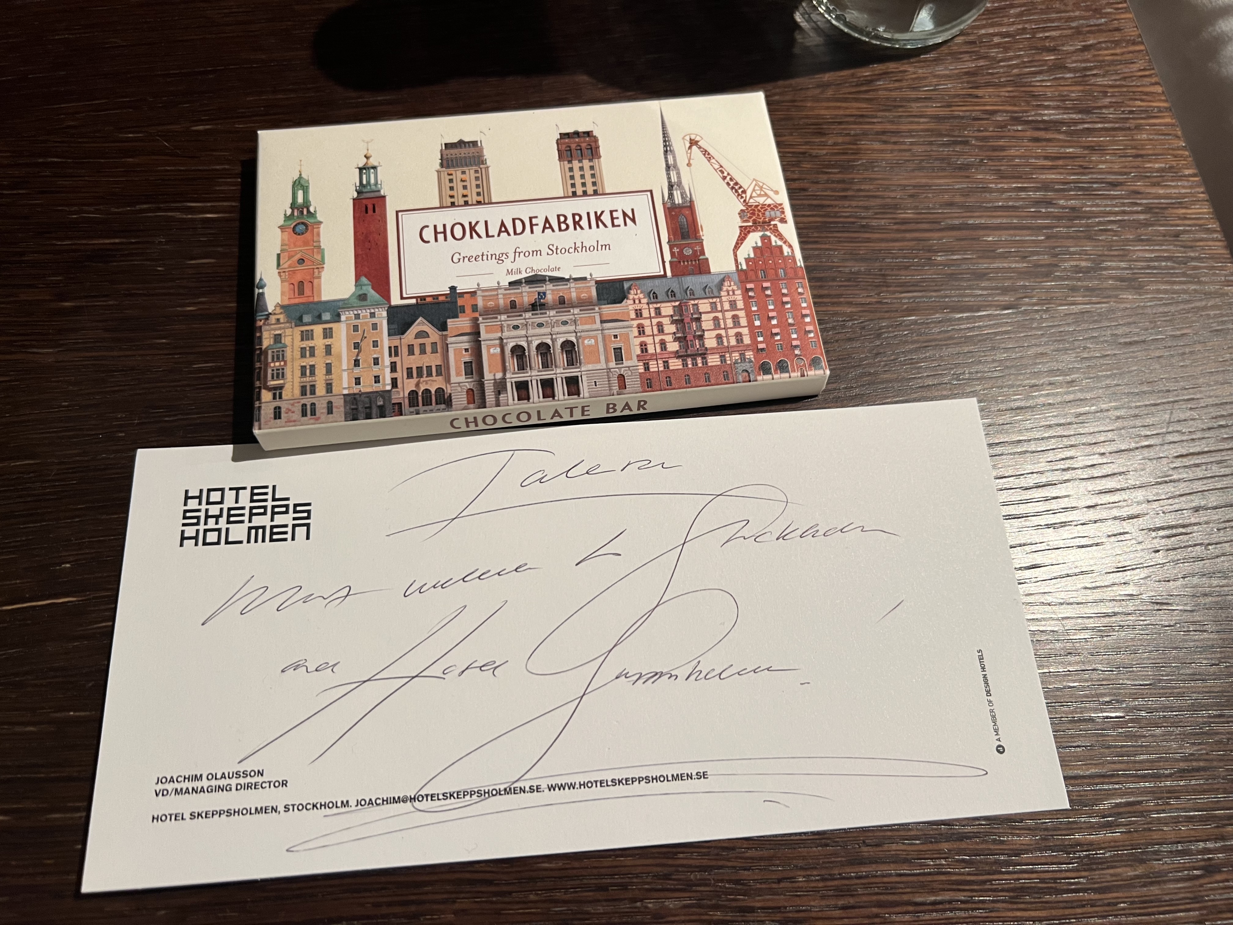 Hotell: Hotel Skeppsholmen, Stockholm Medlemstatus: Marriot Platinum Välkomstgåva: Chokladkaka och två flaskor vatten + ett helt oläsbart handskrivet kort. Någon som kan dechiffrera?