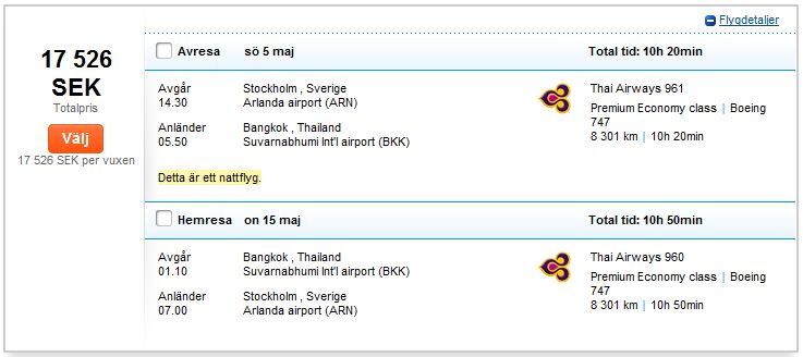[Premium Economy] Stockholm-Bangkok T/R, Thai Airways, 19.200 SEK inkl. skatter