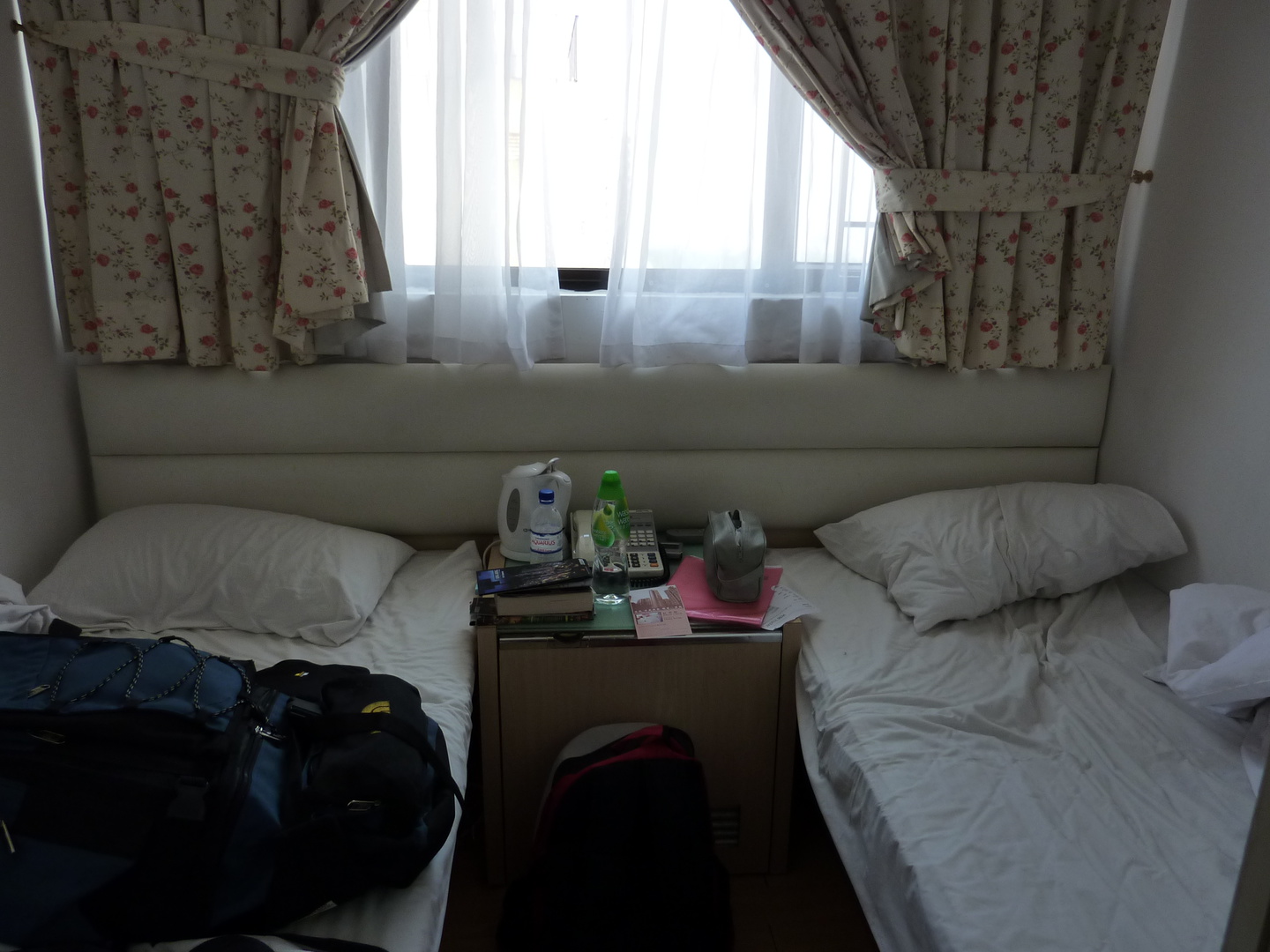 Nästa gång vi kom till HK valde vi Metropark Hotel Wanchai på Hennesey Road vilket vi tyckte var helt ok. Metropark var f.ö. det hotellet som isolerades då de upptäckte en mexikans medborgare med svininfluensan där i slutet av April 2009. Detta innebar att 350 gäster samt personalen inte fick lämna hotellet under en veckas tid. Lyckligtvis för oss hade vi checkat ut två veckor innan detta utspelade sig. Sorry blev lite OT, men här har ni en bild på vårt twinroom på Bridal tea house, lägg märke till hur stor ryggan ser ut att vara så förstår ni hus små sängarna är.