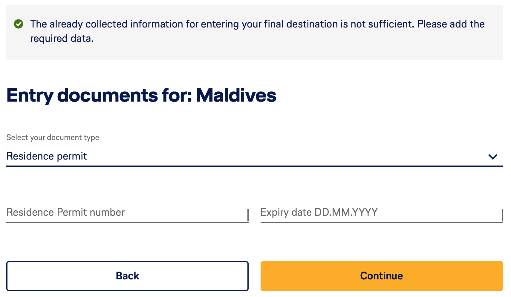 Ska checka in online på Lufthansa för bonusresa (GOT-FRA-SIN-MLE) till Male, och får detta "felmeddelande" under incheckningen. De efterfrågar "Visa" eller "Residence Permit", men visum är inget som ska behövas då det är Visa on Arrival till Maldiverna.