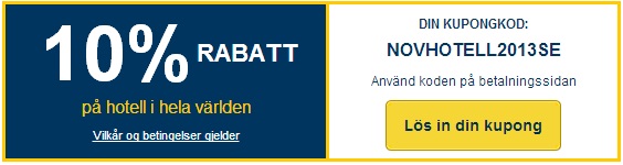 Hotels.com skrev:Hämta nu Kupongen gäller för bokningar som görs mellan 26 augusti 2013 och 9 september 2013 för resor mellan 26 augusti 2013 och 26 januari 2014. De flesta större hotellkedjor deltar ej. Se hela listan här.