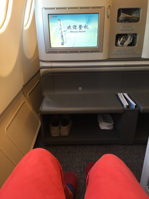 Efter trekantsmacka på den lugna pop-up loungen var det dags för boarding. Prio-boarding fungerade någorlunda. Innan prioboarding annonserades var det dock en lång harang på kinesiska. Jag har ingen aning av vad som sades, men eftersom den stora klungan skingrades något så fungerade det aningens i alla fall. Jag misstänker skarpt att de flesta som var kvar i klungan inte hade någon rätt till prioboarding.