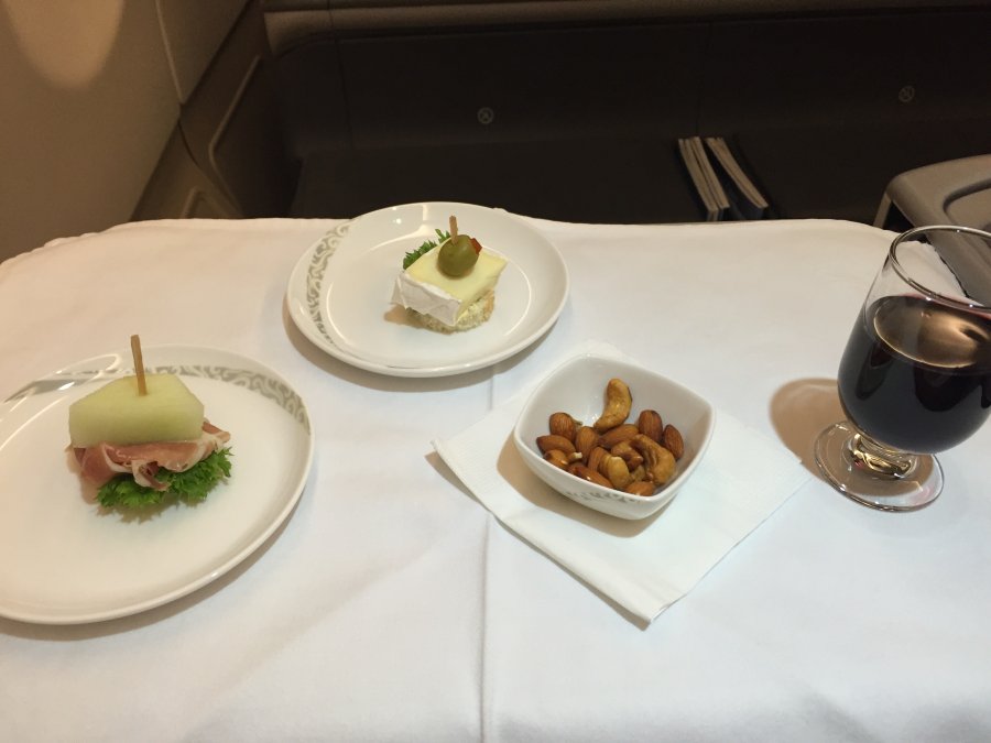 Matserveringen skedde på samma vis som flygningen innan. Menyn drogs tillbaka snabbt och enbart en dryck till all servering. Jag försökte vara väldigt tydlig, vatten till allt förutom huvudrätten, till den vill jag bli serverad rött vin. Det bliv rött vin till allt likt den tidigare flygningen. Nu fick jag dock inte chansen att godkänna vinet, vilket saknades. Drack bara av vattnet. Fick frågan vid förrätten av flygvärdinnan om hon skulle fylla på glaset, så hon tog glaset och kom tillbaka lagom till efterrätten med ett nytt glas vatten.