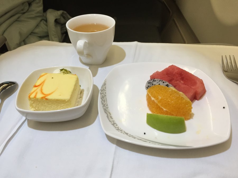 Efter take-off fick vi menyn, och fick välja mellan den västerländska menyn och den kinesiska menyn (båda med två val av huvudrätter). Jag valde middag från den västerländska menyn, och försökte beställa frukost från den kinesiska menyn, vilket tyvärr inte var lastat – så jag fick nöja mig med en västerländsk frukost – kanske bra ändå då jag inte hade någon aning om vad en kinesisk frukost bestod av! Jag bad om att få rött vin till huvudrätten när de frågade vad jag ville ha att dricka. Det innebar att jag fick rött till hela serveringen. Plus i kanten för att de öppnade flaskan framför mig och lät mig godkänna.