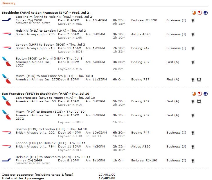 ARN-HEL-LHR-BOS-MIA-SFO-MIA-BOS-LHR-HEL-ARN för 17.401 sek