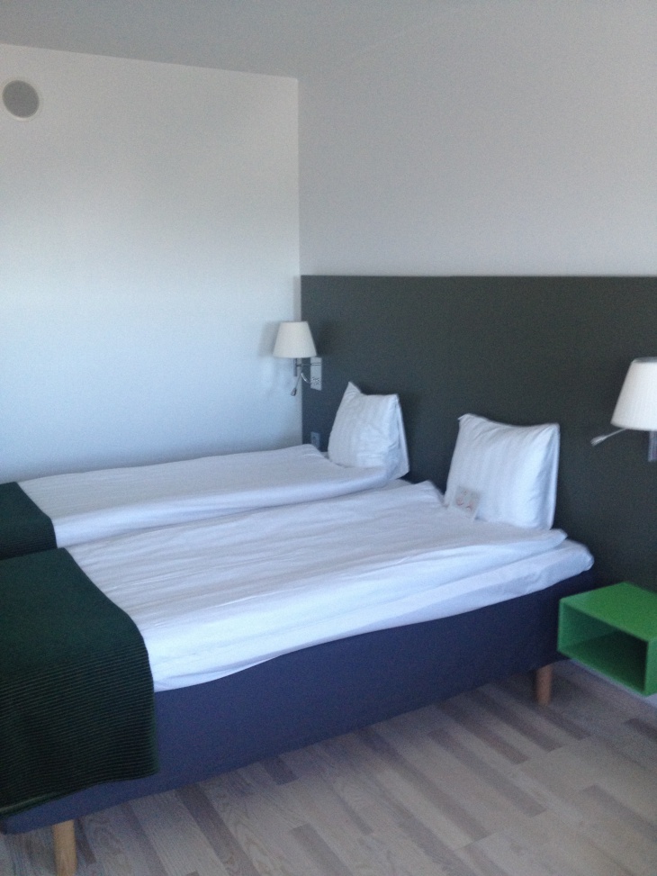 Rummet, ett Twin Room "Flex Level 5" (1595 kronor inkl. frukost) vad nu det innebär var avskalat (således lättstädat) och tämligen basic. Sängarna godkända. Den ljusa parketten gjorde rummet, ja, ljusare. Jag misstänker dock att parketten kommer att bli sliten vad det lider. Jag hade någon bild av att det skulle vara fönster helt i glas men som ni kan se på bilderna var ljusinsläppet något begränsat. Rummet var beläget på våning 14 med strålande utsikt över E4:n i norrgående riktning. Badrummet fräscht. Strykjärn och strykbräda lämnade en del i övrigt att önska.