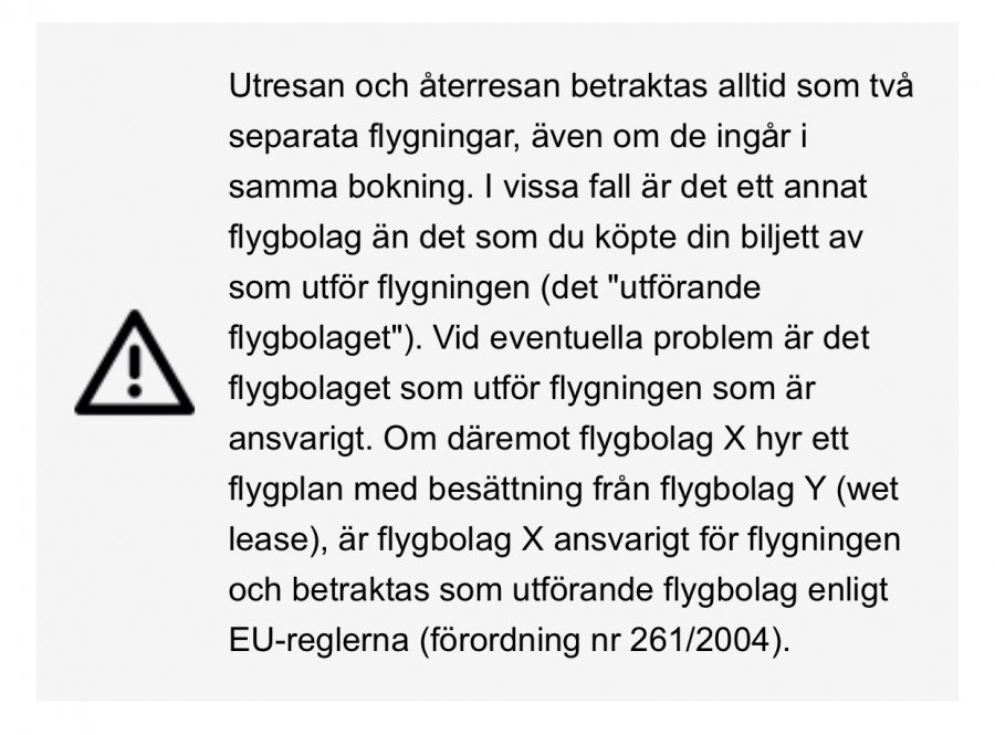 Dessutom droppade mailet in exakt 14 dagar innan hemresa att WAW-GOT blivit inställd. Om jag tolkar det rätt så har flygbolaget rätt att meddela 14 dagar innan flygning, dvs det spelar ingen roll att det är en återresa då utresa/återresa betraktas som två separata flygningar?