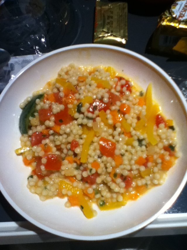 Den där salladen är jag alltid skeptisk emot. Det utlovades kyckling i den, bra att det var vegetarisk. Men jag misstänker att ground personalen på CDG har bestämt att ha det roligt idag och man har lastat fel vagnar för istället för lamm var det kyckling som serverades.