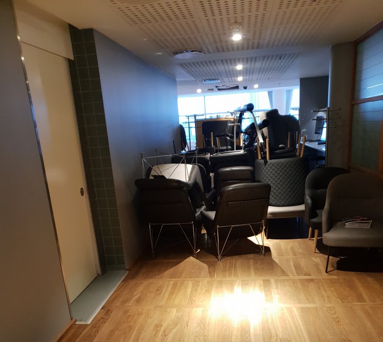 Det ser (efter billederne at dømme) dæleme noget trangt og overfyldt ud? Ikke megen plads til dansegulv, gym, pool, bederum, piano, bar, og bowlingbane....Det har blivit vilstolar samt ett hav av stolar i övrigt......det nu helt öppet mot SAS Lounge - trevligt intryck.
