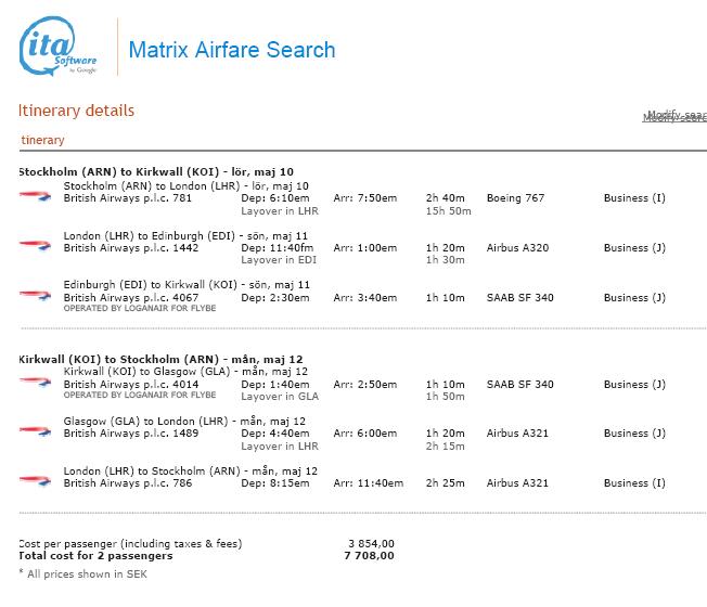 Jag skickade ett mail till Loganair för att få biljetter från Kirkwall - Westray - Papa Westay - Kirkwall på
