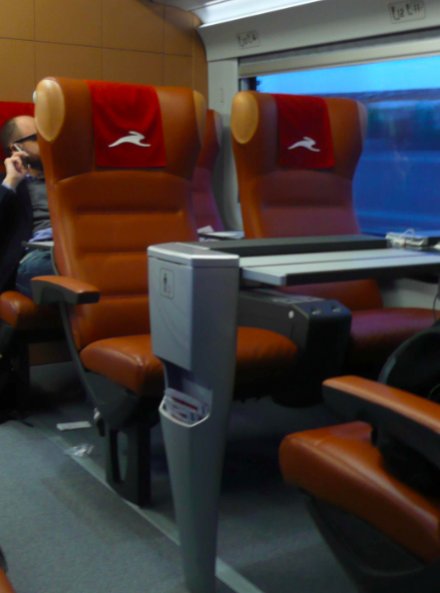 Kl 18.45 glider den röda pilen, enligt tidtabell, in på perrongen. Det är ett långt tåg, med 13 vagnar. I konfigurationen finns tre vagnar för business klass, och en för första klass. Jag rör mig ,i sakta gemak, fram mot förstaklassvagnen (det är lokvagnen) där jag vänligt tas emot av personalen.