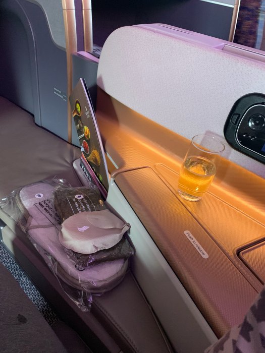 Väl på plats hade dom nu ordnat med lite amenitys så som tofflor, strumpor, sovmask och en filt/täcke som låg på platsen när man satte sig.