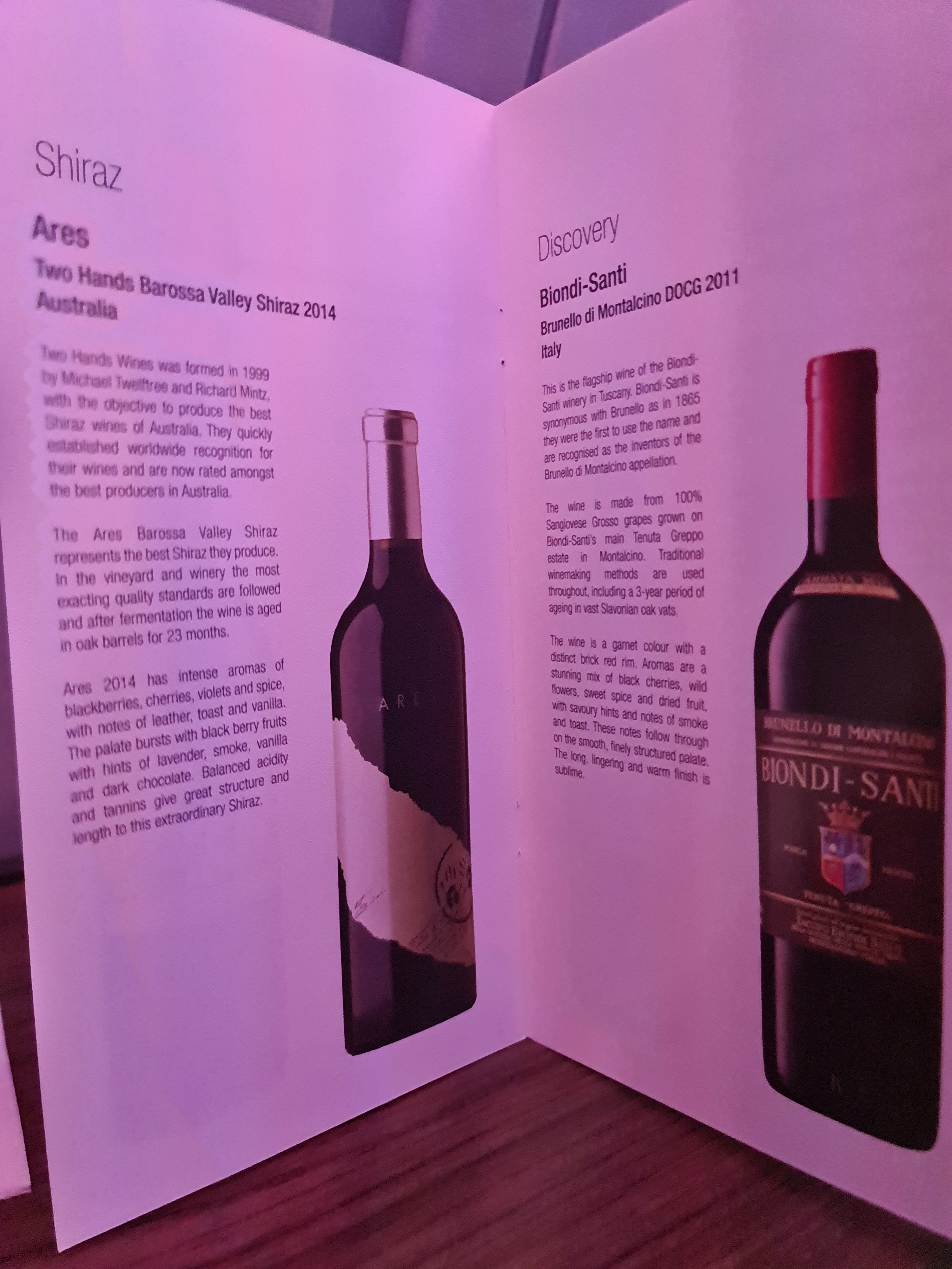 Ingen aning vilket bolag du flyger med, men tydligen ett bolag med mer vin än öl? ;) Om du vill imponera på vinnnördar ska du välja Biondi-Santin, även om Shirazen är kraftigare och kanske ett mer naturligt val ifall det är en kraftig köttbit som serveras. Biondi-Santi är nämligen svår att få tag på, och 2011 är en bra årgång i Toscana (och huvuddelen av Italien). Bordeauxvinet är också riktigt bra och känd, men inte lika svår att få tag på.