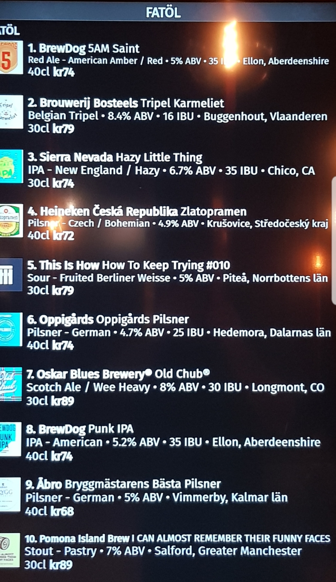 Ja en bättre burk kan ju lätt kosta 100-200 kronor och ändå vara ett helt ok pris. De dyraste burkarna i Liljeholmen brukar kosta 169 och de billigare IPA runt en hundring. Det är enligt mig bra priser, framförallt när man vet att samma burk på bolaget kostar 89 kronor.Priser... Det beror väl på hur man ser det. Jag drack en DIPA från Verdant (Pulp) som gick loss på 119 kronor burken vilket å ena sidan är en ansenlig summa men å andra sidan så gissar jag att samma burk skulle kosta 50-70 kronor mer på finölställen på andra sidan kommungränsen i den kungliga hufvudstaden.