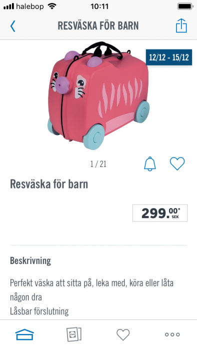 Nästa helg (12-15 december 2019) säljer Lidl en resväska till barn. Halva priset (299kr) mot originalet ( Kids Suitcases & Bags | Kids Luggage | Trunki ). Har yttermått som faller inom handbagage. Finns i flera olika färger/mönster.