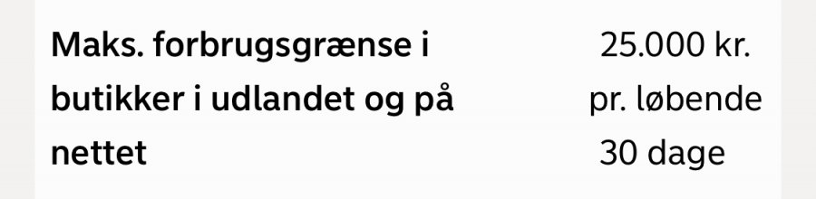 Hittade ”felet”. Man kan bara handla i butiker utomlands samt på nätet för 25 000 DKK per 30-dagarsperiod (vilket är helt sjukt faktiskt).