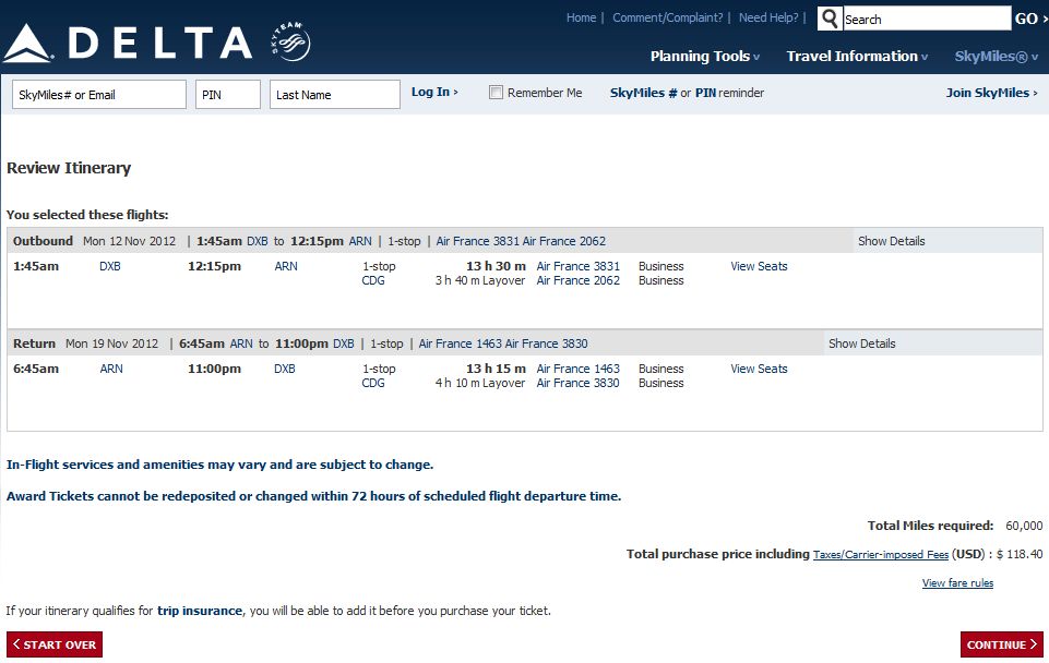 När man bokar en bonusresa mellan Stockholm-Dubai t/r i Business class med Delta Skymiles, kostar det 60.000 miles + skatter 651,80 USD.
