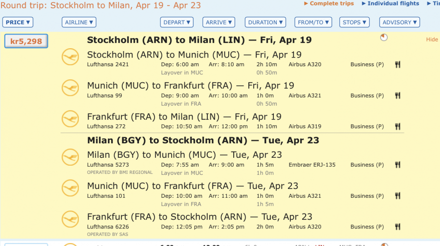 Skall åka till Milano våren 2019. Söker efter biljetter som ger bäst med EB poäng till ett "rimligt" pris (se budget). Layovers går bra och besöker gärna trevliga loungar. Är EBG för tillfället. Jag kan i princip använda hela dagarna för departure/arrival för resandet.