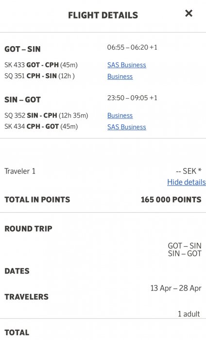 Jag har t.ex. via United hittat GOT-Singapore med stopover i Peking 13-28 April. Flygs av SAS och Air China för totalt 200 000 poäng som ju är lite över budget just nu. Är dock sjukt rookie på att hitta flighter så hade varit evigt tacksam för hjälp och input.. *