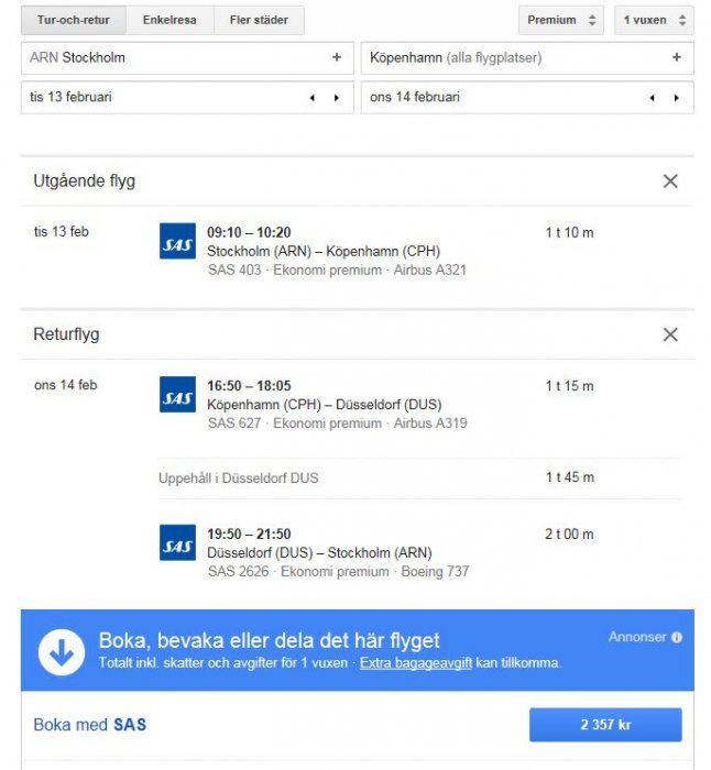 Såhär ser det ut på Google Flights. Lyckas som sagt inte få fram alternativet på SAS hemsida när jag går vidare via länken. Hittar däremot samma alternativ via flygresor men vill helst inte boka via någon mindre känd nätresebyrå...