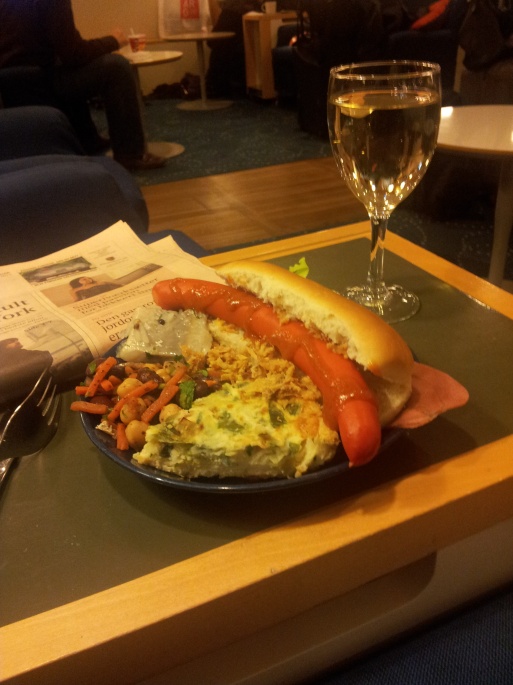 Vi landade i tid i Köpenhamn. Hade inte jättelång bytestid, men det blev ändå ett besök i loungen. Valde för omväxlings skull SAS Business Lounge som var välbefolkad. Pölsevagnen stod framme och det blev en tallrik mat.