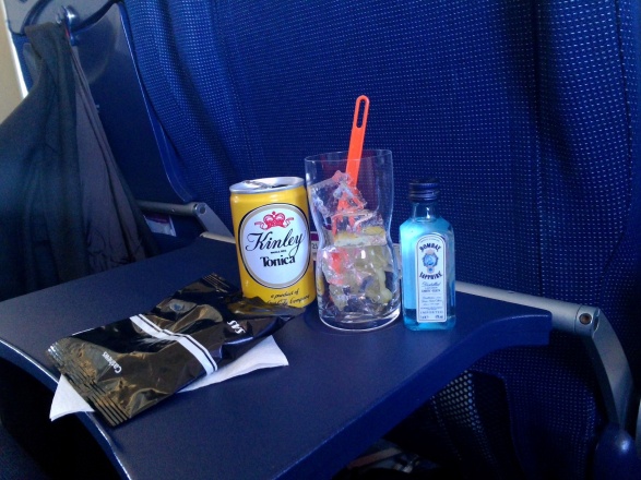 Detta plan hade enbart en divider och inget skynke. Uppe i det blå serverades först en fördrink och eftersom det var fredag blev det självklart en GT tillsammans med cashewnötter.