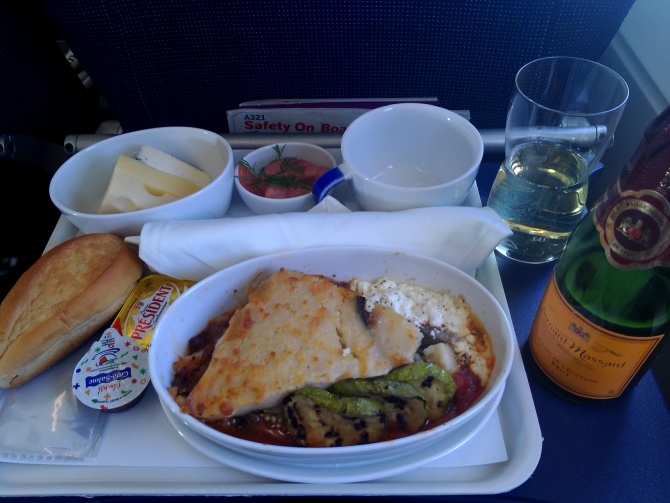 Varmt bröd, kaffe/te/dryck erbjöds. Allting var helt okej, men ändå inget speciellt. Konstaterade här att det inte är någon idé att flyga mer än Economy hos Sas för en morgonflygning. Det är inte värt priset att betala extra för Extra för morgonflygningar av den här längden. Efter frukosten slöt jag ögonen någon timma och sedan blev det mer av en lunchflygning. Flygvärden uppmärksammade att jag hade vaknat och frågade om jag ville ha något att dricka. Bad om ett glas vatten. ”Ska du inte ha något mer. Öl, vin?”, frågade han. Okej då. Jag tar lite mousserande. Fick ett val av två sorter och jag valde Louis Perdrier