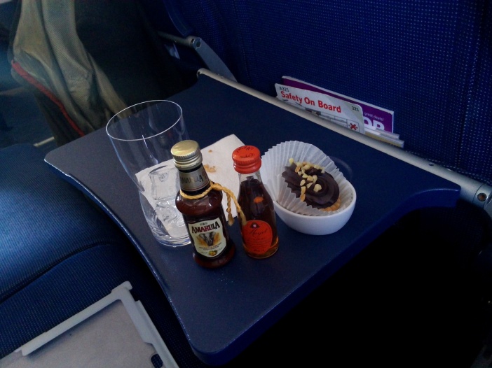 Trodde att detta var det hele, men det fanns mer att vänta. Fick en liten sötsak tillsammans med den lille serverad på ett fat. Tänkte pröva Amarula för första gången. Fick då tips av en dansk flygvärd att blanda det med Cognac. Detta blev mycket gott och det hela kändes som en typisk SAS-drink.