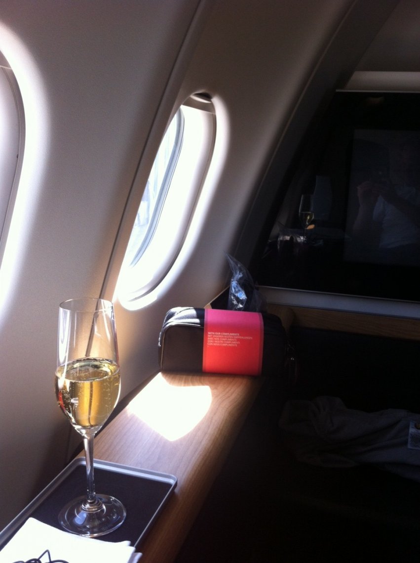 Aldrig tråkigt gå ombord på Swiss A330 med ett F Boarding pass i handen ( Plats 1 A). Väl ombord serveras canape & Champagne. Amenity kit delas ut ( Dock ingen pyamas på denna dag flight till DXB, stolsgrannen i mitten frågade dock och fick en !!) Swiss amenity kit i F är av mycket högre klas än Lufthansas med bl.a La Praire produkter. LX Serverar Laurent-perrier Grand Siecle Chapmpagne.