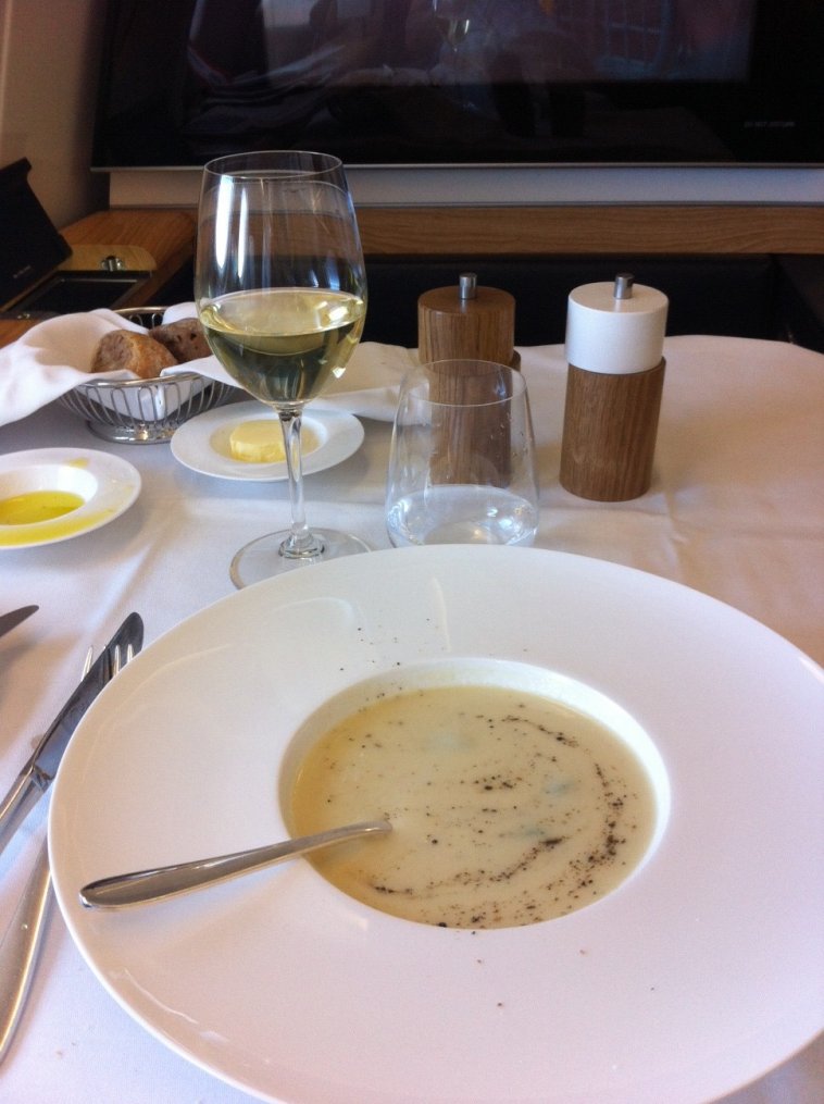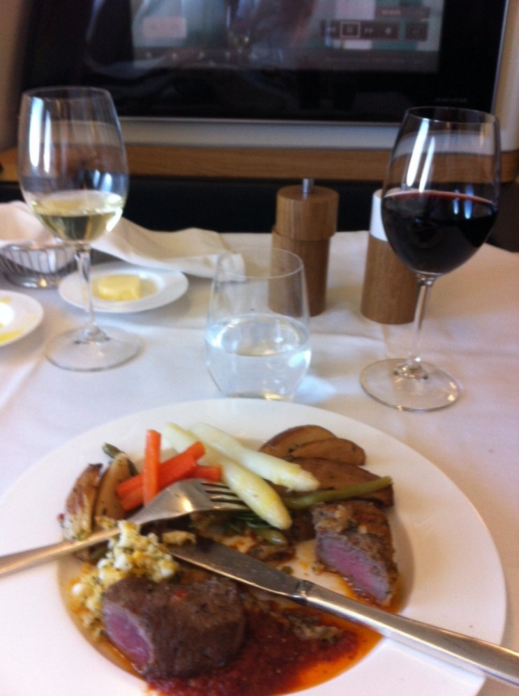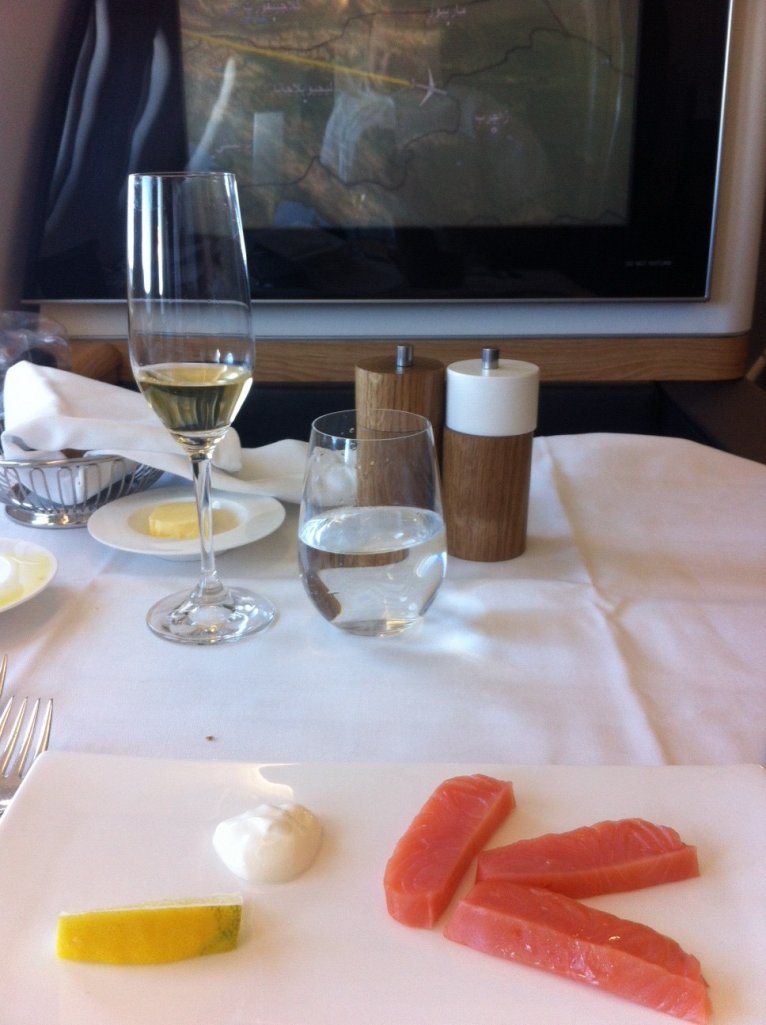 Efter start från ZRH ut över Bodensjön och in över Österrike och Innsburck försvnner tyvärr alperna i moln och det blir ganska turbulent. Flygvärdinnorna dukar upp ett perfekt serveringsbord med duk, kryddor, olivolja, brödkort etc. Mer eller mindre perfekt i mit tycke. Till detta väljer jag lite utsökt Balik Laxfile, samt en Sparrissoppa. Det är så bra det kan bli ombord !