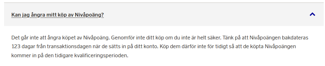 Rekommendationen är väl alltid att ha köp av nivåpoäng som sista utväg. Det går nämligen att göra i efterskott, dvs efter medlemsåret slutat och man upptäcker att poängen inte räckte till för att förnya nivån, köper man nivåpoäng som bakdateras.