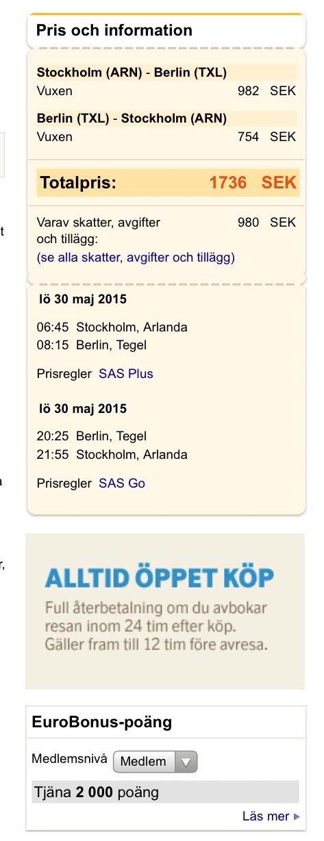 Ja precis. Det glömde jag skriva angående Berlin. Man måste ha två enkelbiljetter om man vill åka ut och sedan ta samma flyg tillbaka.En heldag i Berlin?
