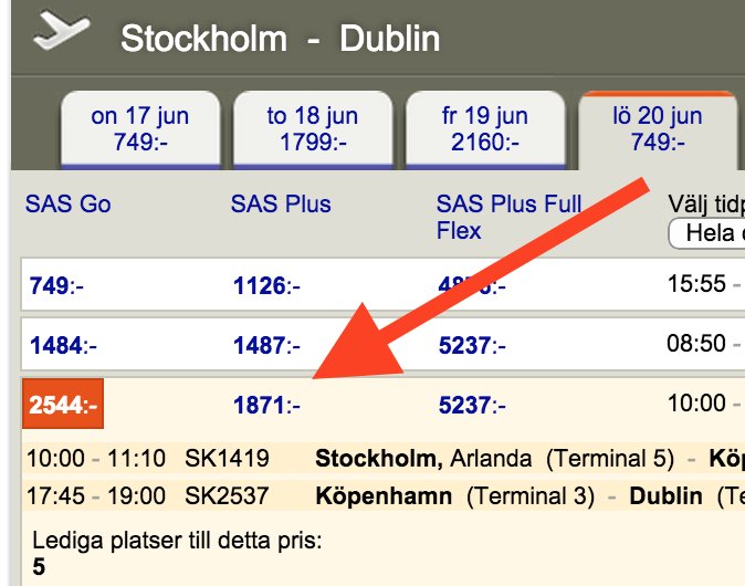 Om någon IKEA-anställd skulle göra en tjänsteresa med aktuellt flyg skulle denne ändå behöva boka SAS Minus av principskäl.ARN - DUB. Verkar vara lite spännande prissättning just den dagen. 20/6.
