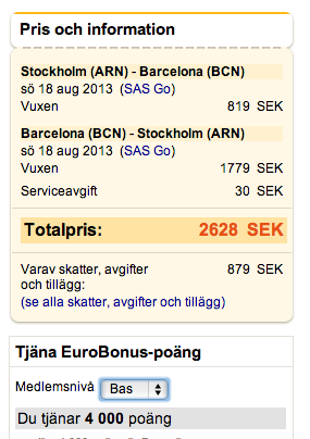 Efter att ha hållit koll på priserna ett tag har jag nu ändrat hemresan till SAS plus - en enkel BCN-OSL-ARN i plus gick på knappa 2,600kr och ger 5,000 baspoäng (innan ev. bonus) vilket mer än väl säkrar behövda poäng.