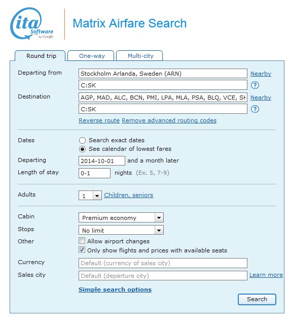 Vill man själv hitta bra MR i SAS Plus är det ganska enkelt med Matrix. Välj routing code C:SK på både inbound och outbound, välj "see calendar of lowest fares", premium economy cabin, kryssa ur "allow airport changes" och som destination anger du: