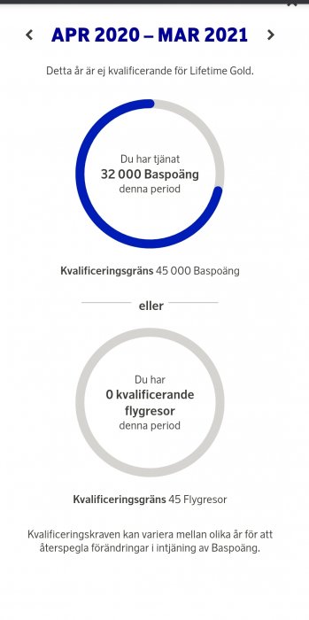 Fast problemet är att min grace passerats. Var Diamond t o m juni 2021. Fick alltså förlängd Diamond för kvalåret 2019-2020 där jag bara lyckades nå guld själv. Har inte fått något alls för kvalåret 2020-2021 som du kan se på bilden ovan. Har alltså tappat Diamond samt förlorat min LTG-streak. Kötid hos SAS som Guld är inte kul