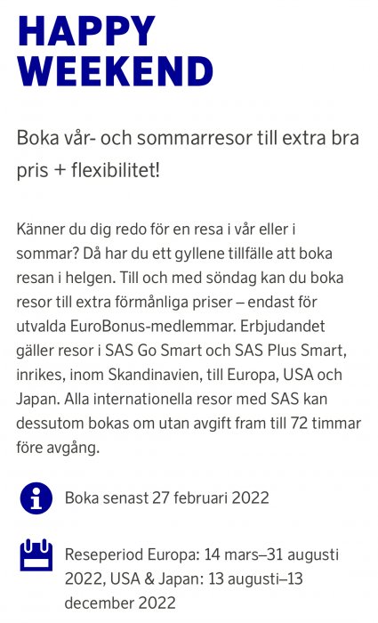 Någon mer som fått Mail om happy weekend ? Kommer direkt till inloggningssida, vilket är jäkligt mysko i sig, men då det ligger under SAS är det väl ok. Men kommer inte vidare sen…