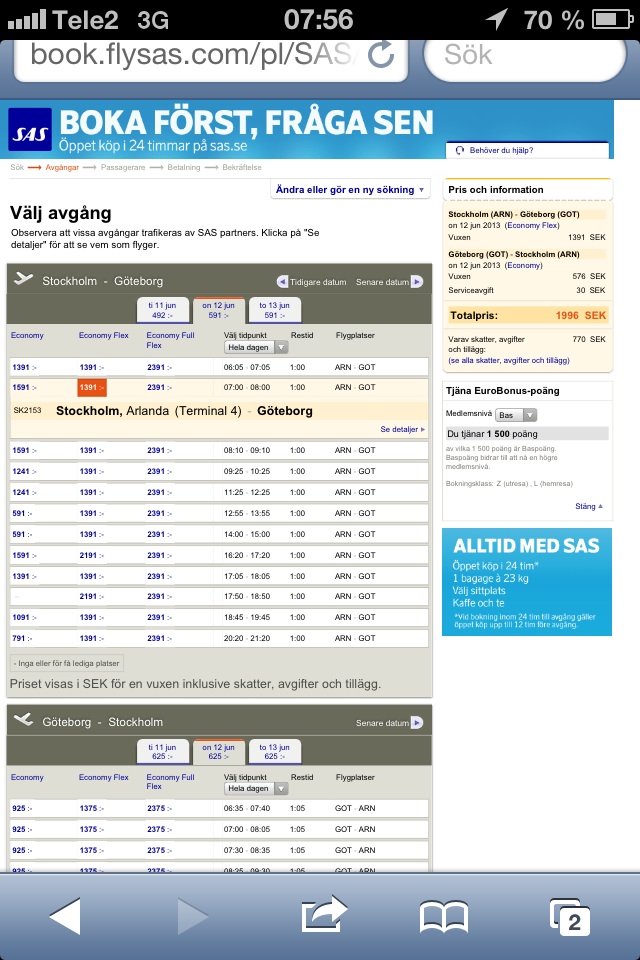 7660SEK+skatt för den dyraste biljetten med SAS mellan Stockholm och Madrid är ju fortfarande mycket pengar men betydligt lägre än tidigare då jag tror den låg närmare 10000+skatt. 2384+skatt för den billigaste ser ju lovande ut.